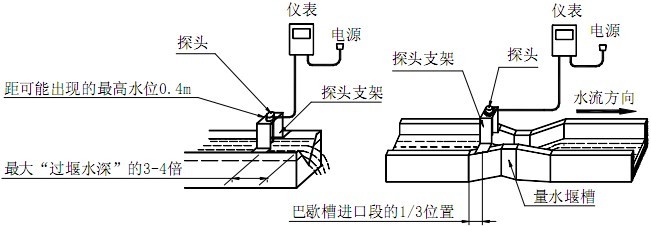超声波明渠流量计的探头可以直接安装在量水堰槽水位观测点的上方。探头发声的一面要对准水面。可以用水平尺放在探头上盖上,通过校上盖水平使探头对准水面。巴歇尔槽水位观测点在距喉道2/3收缩段长位置(如图7.4的La);三角堰、矩形堰在上游一侧,距堰板3~4倍最大过堰水深处。(如下图)