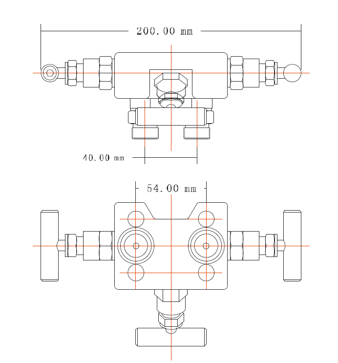 2、安装尺寸:(1)阀体两端四孔中心距离:54×41.3mm。(2)阀体四孔孔径:接仪表正负压容室侧:4-Φ12。