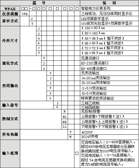 三相交流有功、无功功率表;双屏数字显示;外形尺寸80×160;RS-485标准串行通讯;(4~20)mA 变送输出;三相四线制;开关电源供电;电压输入0~220V;输入电流0~5A; 有功显示3300W,无功显示3300VAr。